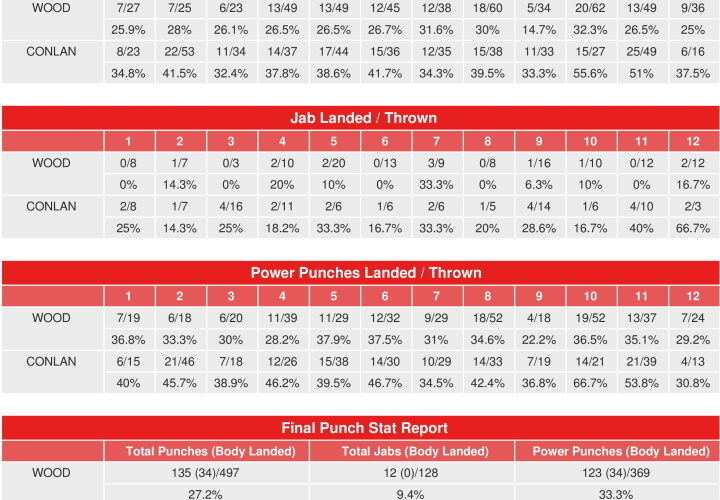 An unbelievable finish, as Michael Conlan seemingly ahead on all cards and outlanding Leigh Wood 171-135 in total punches, got caught on the ropes and was send head first out of the ring. Wood showed unbelievable grit, as 80 of Conlan’s 171 landed punches were body shots. Conlan landed 44% of his power shots. Wood landed 33% of his power ...