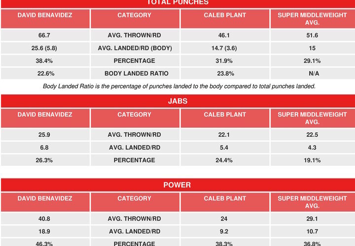 David Benavidez’s rank among CompuBox Categorical Leaders – 38.4% – total connect pct.- ranks #1, 46.3% power conn. pct. – ranks #3. 26.3% – jab connect pct – ranks #3 25.6 punches landed per round – ranks #4. And a +16.7 plus/minus rating – ranks #4, 6.8 jabs landed per round – ranks #5, 18.9 power landed per round – ...