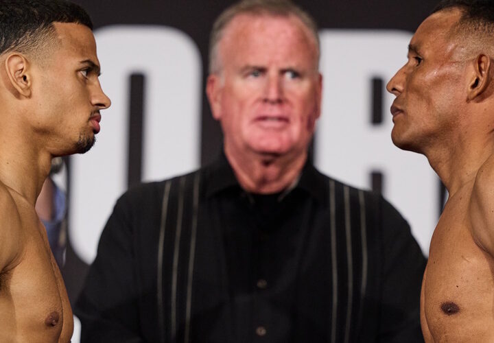 Janibek Alimkhanuly was all business throughout fight week and ever the professional at the scale. A well-distributed and career light 159.2 pounds graced the frame of Kazakhstan’s Alimkhanuly (13-0, 8KOs), who attempts the second defense of his WBO middleweight title. He faces Montreal’s Steven Butler (32-3-1, 26KOs) who was 159.6 pounds for their scheduled 12-round bout which airs live this ...
