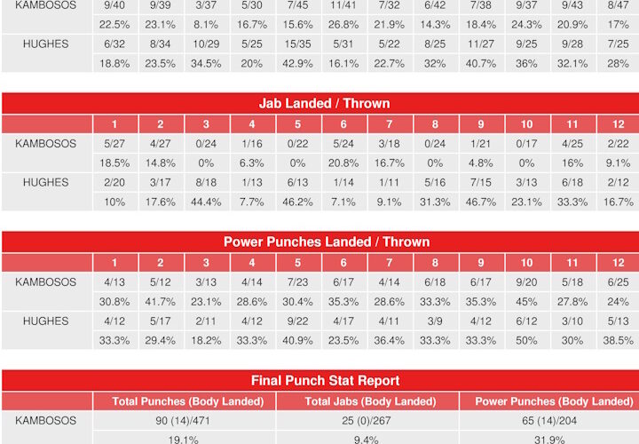 In the ESPN main event, former unified lightweight world champion George Kambosos scored a majority decision over IBO Maxi Hughes. Hughes was 98 of 338, 29% in total punches compared to 90 of 471, 19% for Kambosos. Kambosos held a 12 connect advantage in power punches, while Hughes held a 20 connect advantage in jabs. Scores were 114-114, 117-111 and ...