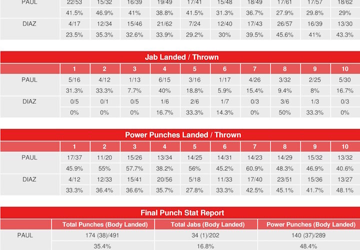Although Paul and Diaz landed almost the same amount of power punches, Paul’s punches were generally harder. Paul had an easier time setting up his power punches, connecting on 48% of them, while Diaz landed 39% of his power punches. Diaz only threw 45 jabs (landing 8), while Paul threw 202 jabs (landing 34). Paul’s use of the jab to ...