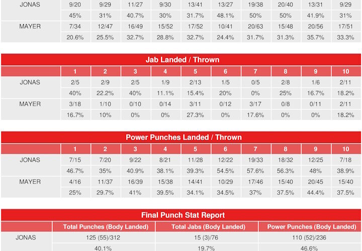 Mikaela Mayer threw 181 more punches than Natasha Jonas, but only landed 24 more punches owing to Jonas’s accuracy. Jonas had the reputation for being the heavier-handed fighter coming into this fight because of her knockout record and Mayer moving up in weight. However, it was Mayer who landed 27 more power punches, forcing Jonas into the ropes throughout the ...