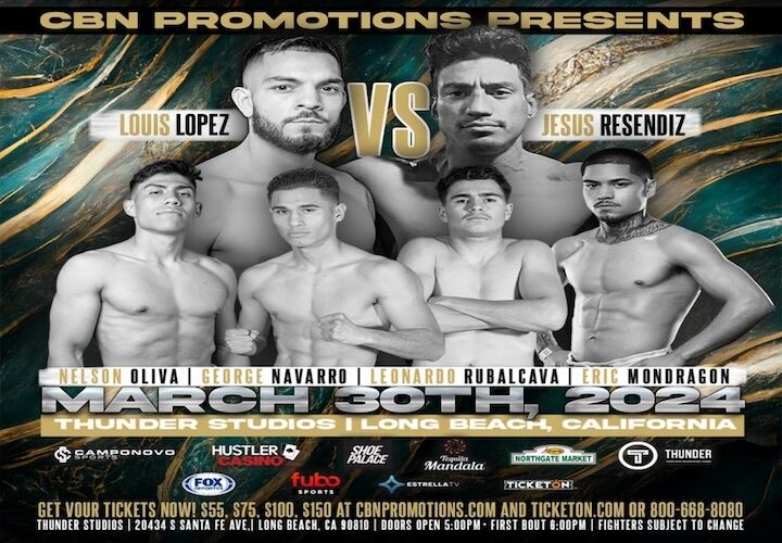 On March 30, CBN Promotions will present its second show of 2024, set to take place at Thunder Studios in Long Beach, California. In the eight-round super welterweight main event, local favorite Louis Lopez (14-2-2, 5 KOs), hailing from Corona, California, will face off against Jesus Resendiz (8-0-1, 6 KOs), from San Diego. The co-main event features a six-round super ...