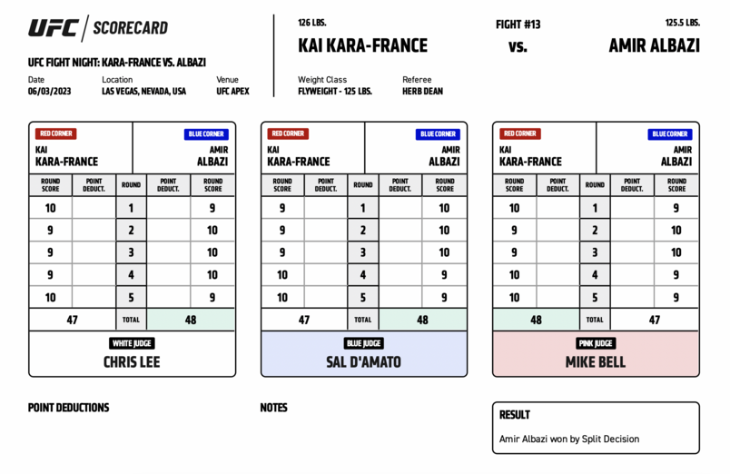 Other notable names, including Sergio Pettis, Muhammad Mokaev, and Alexander Volkanovski, all took issue with the scoring of the fight, with many highlighting the decision of Chris Lee to award Round 4 to Albazi, despite Kara-France comprehensively outstriking him in that round, as a major sticking point in the overall outcome.