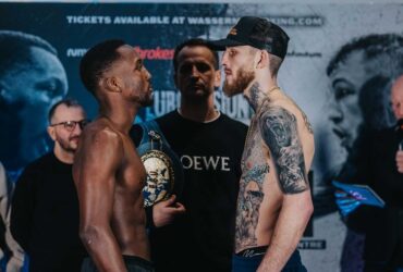 Germany’s Abass Baraou fights England’s Sam Eggington for the vacant ...