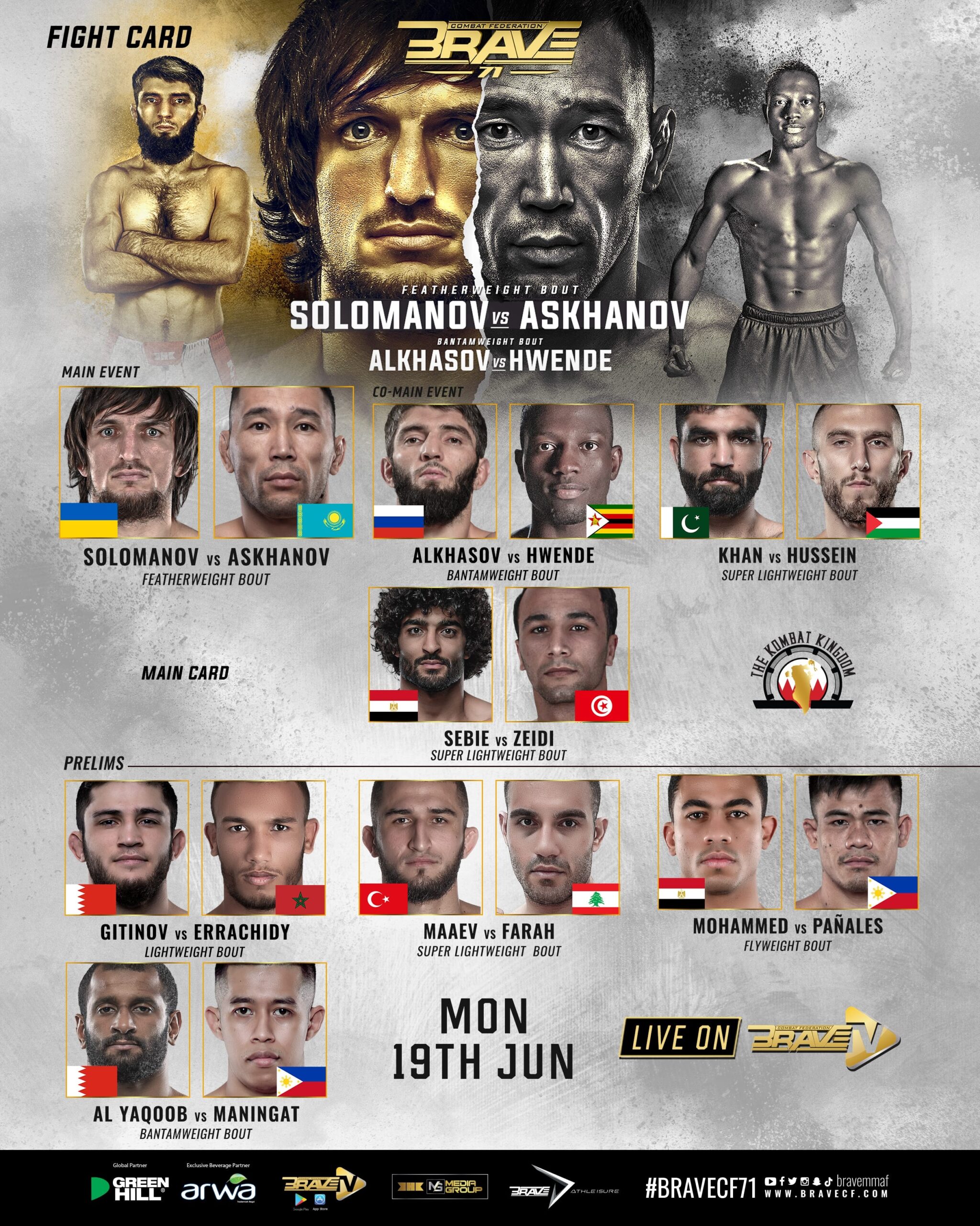 Brave Combat Federation has announced the full fight card for the first of two upcoming events in the Kingdom of Bahrain. Brave CF 71 will take place on June 19, with Brave CF 72 following hot on its heels, just four days later, on June 23.