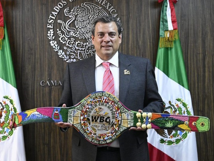 This morning at the main hall of the Mexican Chamber of Deputies, WBC President Mauricio Sulaiman unveiled the commemorative belt that will be presented to the winner of the upcoming super middleweight clash between Saul “Canelo” Alvarez vs. John Ryder.