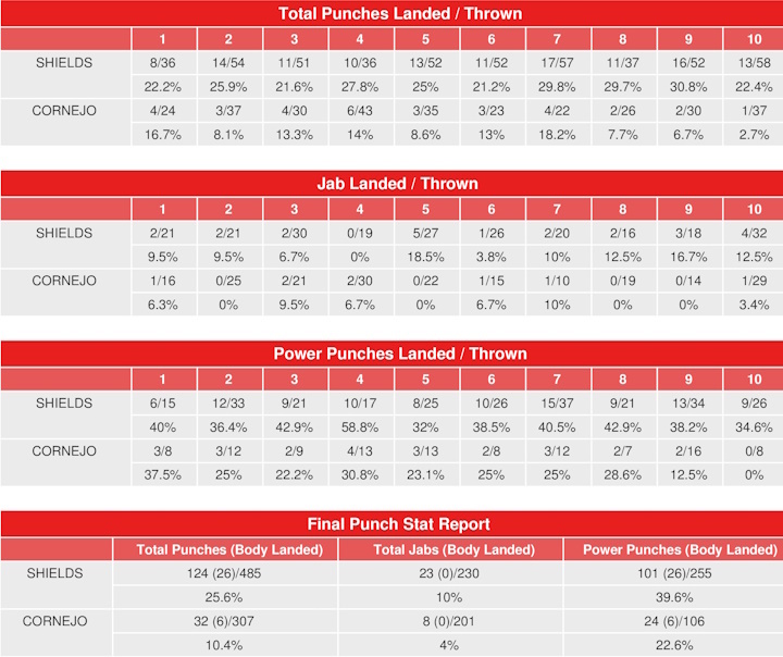Shields was more active (48.5 punches per two-minute round to Cornejo’s 30.7) and more accurate (26% vs. 10% overall, 10% vs. 4% jabs, 40% vs. 23% power), which resulted in Shields landing nearly four times as many total punches (124 vs. 32) and almost three times as many jabs (23 vs. 8).