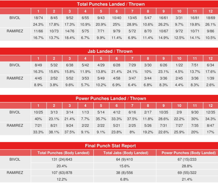 Ramirez successfully forced a fast pace by averaging 73.2 punches per round to Bivol’s 53.6, but Bivol won by keeping the fight at ring center and forcing Ramirez to fight the jab-heavy fight he prefers. The proof: Jabs comprised 63.8% of Bivol’s total output, similar to the 71.4% rate in his last five, but they also made up 63.3% of Ramirez’s output compared to 40.1% in his last five.