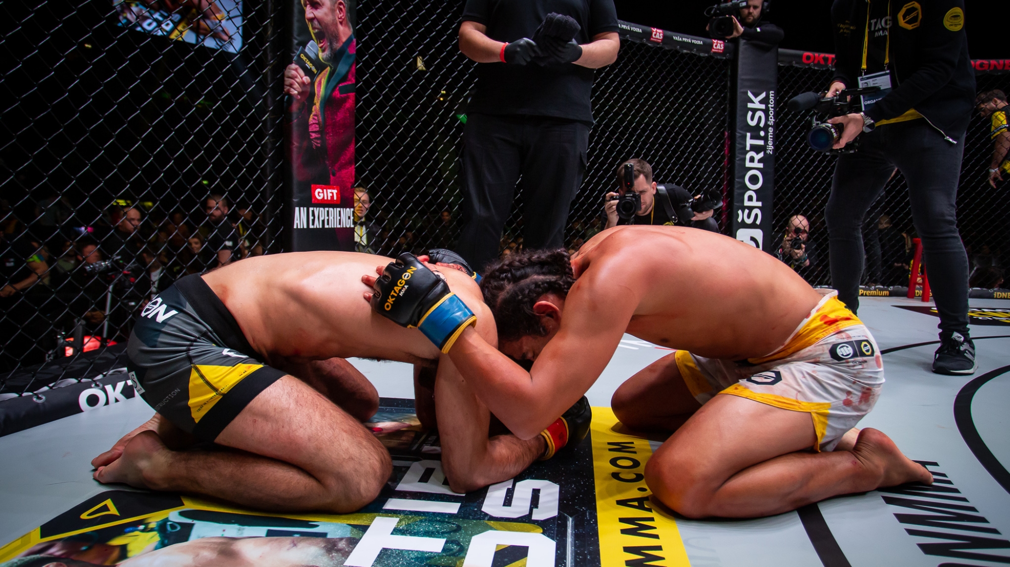 It was rinse and repeat in the following round, as Staines landed another early takedown, evaded another Frimpong guillotine attempt, and delivered another dominant round. But this time there was a finish on the end of Staines’ work as he locked up a high-elbow guillotine from the mount to force the tap from Frimpong and claim a huge victory, exact some revenge on his tormentor, and win the Oktagon Challenge title.