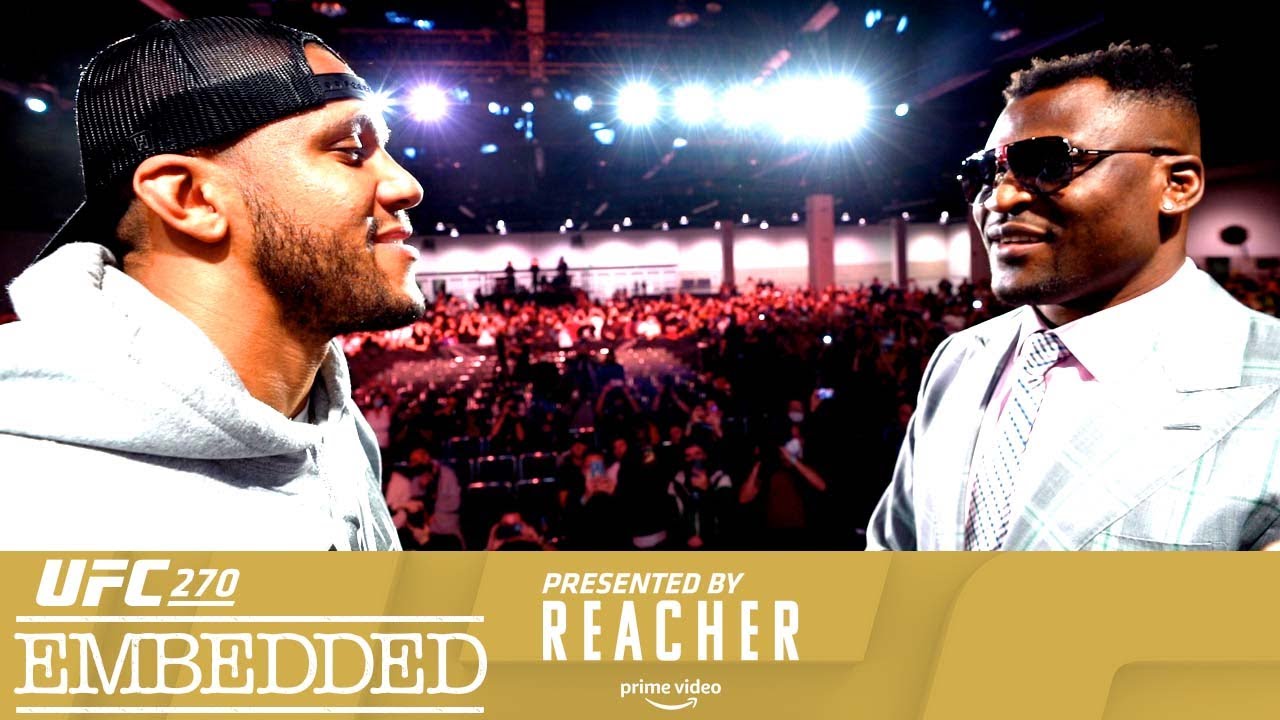 As described on the UFC’s official YouTube channel, on Episode 5, “Champ Brandon Moreno stays high energy. Champs Kamaru Usman and Francis Ngannou work out together. Ciryl Gane spars. Moreno and Deiveson Figueiredo trade barbs at the press conference, then the title fighters square off.”