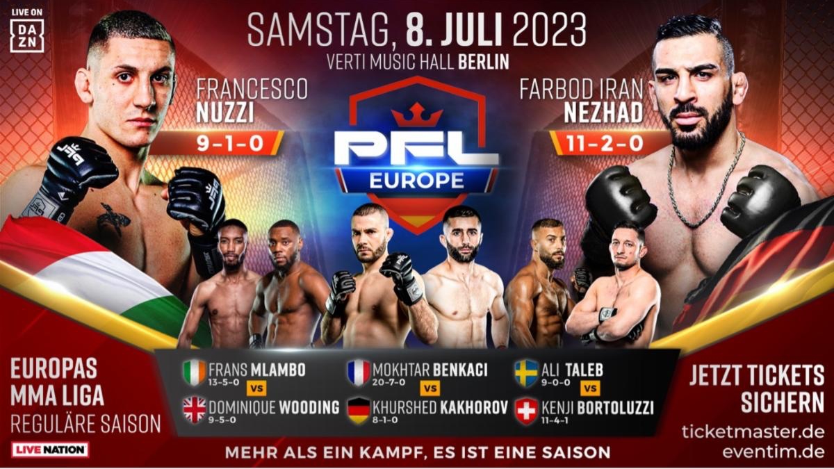 Berlin-based bantamweight Farbod Iran Nezhad will headline against Italy’s Francesco Nuzzi, who kicks off his PFL Europe campaign riding an eight-fight win streak, while German striker Khurshed Kakhorov will take on experienced French contender Mokhtar Benkaci in the co-main event.