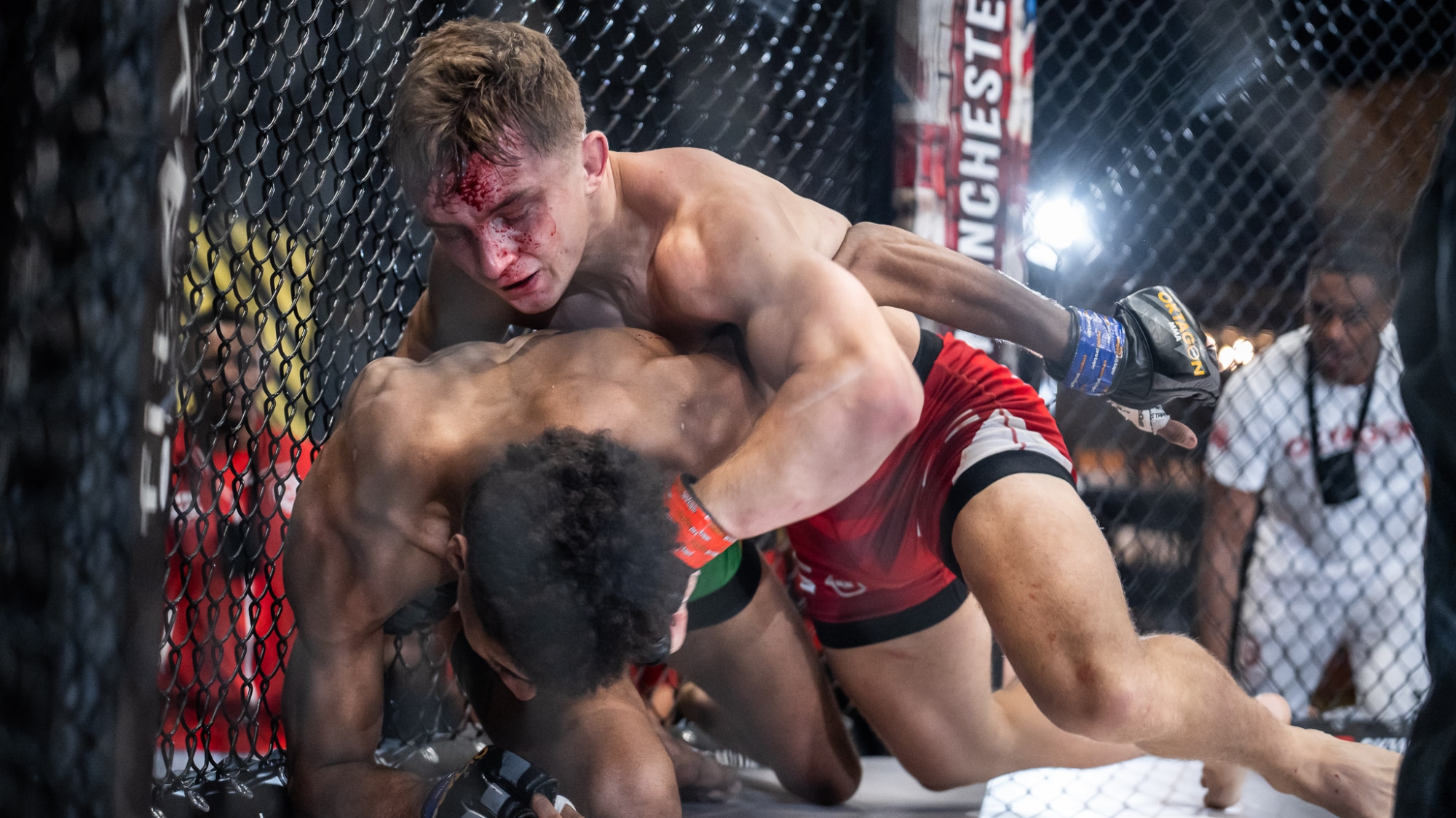 Undeterred, Gavin stayed on the front foot and landed a looping right hand as Frimpong was backtracking. The shot sent the Irishman to the mat, but he worked quickly to get back to his feet. Feeling his opponent was in danger, a bloodied Gavin stepped up the pace, tying Frimpong up in a clinch and taking the action back to the cage floor.