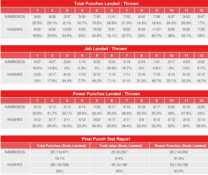 Kambosos held a 12 connect advantage in power punches, while Hughes held a 20 connect advantage in jabs. Scores were 114-114, 117-111 and 115-113.
