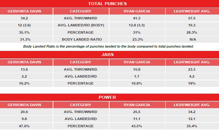 Davis’ low punch output will be nothing new for Garcia, who’s opponents threw just 30.9 punches per round.