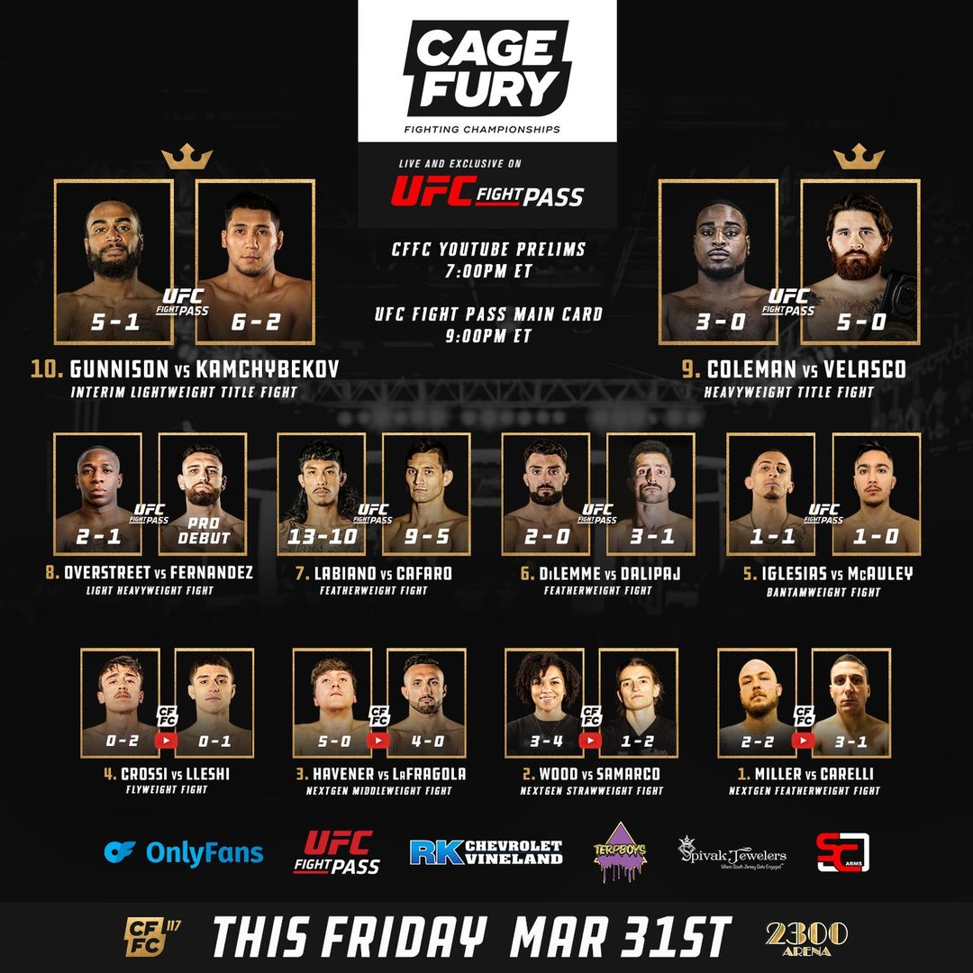 Velasco captured the title with a unanimous decision victory over Kevin “King Kevi” Sears at CFFC 113 in October 2022. Now “The Viking King” is set for action in the co-main event of CFFC 117 on Friday, March 31, when he’ll look to defend his belt against the challenge of Ronald Coleman at the 2300 Arena in Philadelphia. The event streams live on UFC Fight Pass.