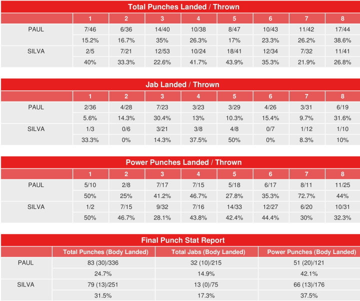 Jake Paul landed 51 of 121 power punches (44%), while Anderson Silva landed 66 of 176 of his power punches (38%). The difference for Paul was his jab. He threw 215 jabs, 140 more than Silva, and landed 32. 30 of Paul’s 83 landed punches were body shots. Paul landed/threw fight high 17 of 44 punches in round 8.