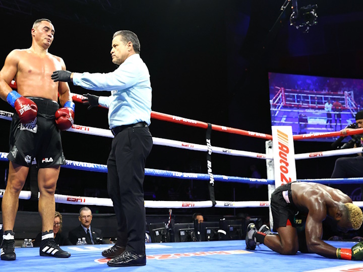 Flores sternly warned Kossobutskiy for yet another punch below Ajagba’s belt with 20 seconds to go in the third round. Once Kossobutskiy strayed low again approximately 30 seconds into the fourth round, Flores disqualified him.
