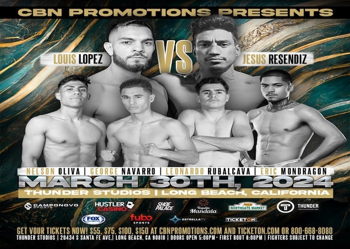 On March 30, CBN Promotions will present its second show of 2024, set to take place at Thunder Studios in Long Beach, California. In the eight-round super welterweight main event, local favorite Louis Lopez (14-2-2, 5 KOs), hailing from Corona, California, will face off against Jesus Resendiz (8-0-1, 6 KOs), from San Diego.