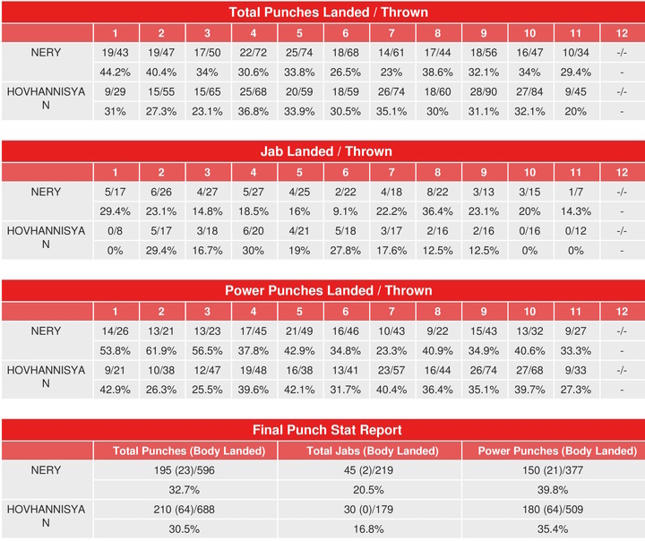 As the fight wore on, Hovhannisyan’s body punches slowed Nery down allowing Hovhannisyan to tilt the power punches landed in his favor 101 to 56 in rounds seven through eleven.