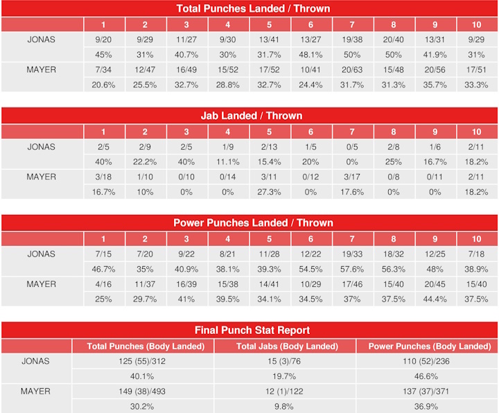 Jonas landed timely counters, focusing on Mayer’s body to the tune of 55 landed body punches. Over a frenetically-paced 9th and 10th rounds, Mayer edged Jonas in power punches landed 35-19.