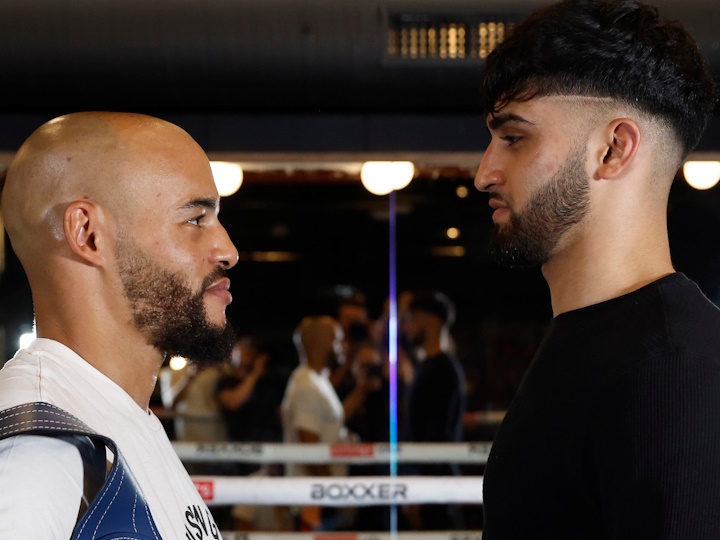 LONDON, ENGLAND – European middleweight champion Franck Petitjean (24-6-3, 6 KO’s) travelled from Paris to London today for a face-off with British boxing’s brightest prospect, super-lightweight wonderkid Adam Azim (9-0, 6 KO’s), who aims to take his EBU title from him by force on November 18th when they clash in the main event of BOXXER: WOLVES AT THE DOOR. (photos by Lawrence Lustig)