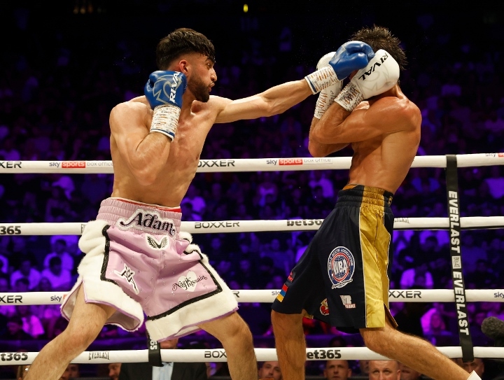 Manchester – In a junior welterweight bout, Adam Azim (9-0, 6 KOs) was made to work in winning a ten round unanimous decision over Aram Fanyan (23-2, 5 KOs). (photos by Lawrence Lustig)