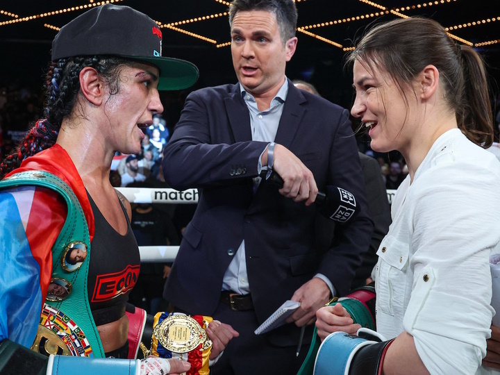 After the fight, undisputed lightweight champion Katie Taylor entered the ring, went face to face with Serrano, as they announced their rematch for May 20th in Dublin, Ireland.