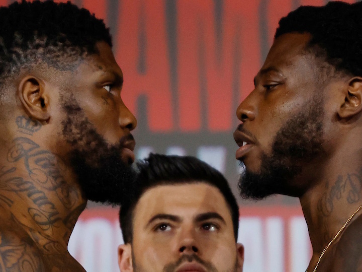 Tomorrow night’s British Cruiserweight Championship and Commonwealth Cruiserweight Championship bout between defending champion Mikael Lawal and challenger Isaac Chamberlain is officially on as both fighters made weight at today’s pre-fight weigh-in ahead of Saturday’s BOXXER event at York Hall. (photos by Lawrence Lustig)