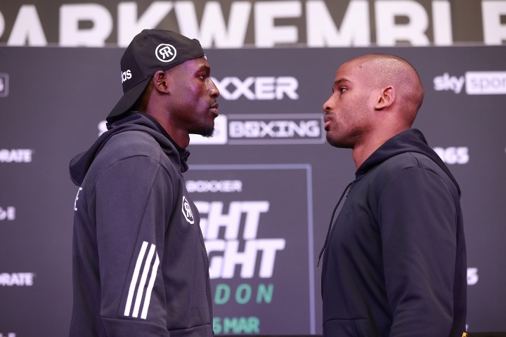 London cruiserweight rivals Richard Riakporhe and Deion Jumah faced off today after a press conference which featured the elite crop of today’s top rising talents in British boxing, including light-heavyweight champion Dan Azeez, Caroline Dubois and the Azim brothers Hassan and Adam. (photo by Lawrence Lustig)