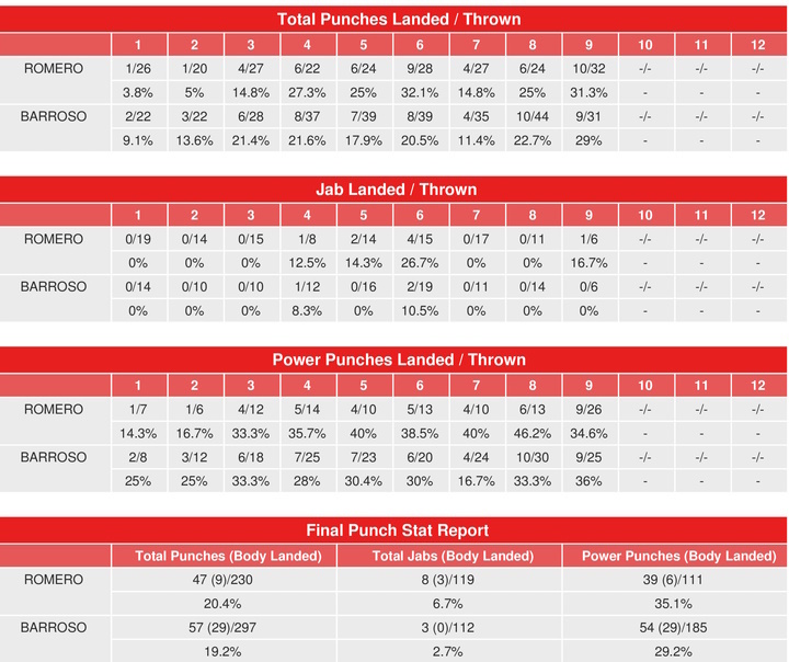 Cosmopolitan Las Vegas – Ismael Barroso was busier than Rolando Romero, averaging 33 punches thrown per round to Romero’s 26. Barroso out-landed Romero in six of the nine rounds fought. 29 of the 54 power punches Barroso landed were to Romero’s body. Romero landed 39 power punches.