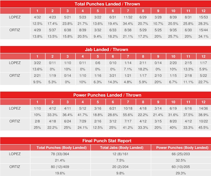 They were separated by one landed punch in four rounds, and in the remaining four rounds they were separated by no more than three landed punches. Lopez landed 6 more power punches and 21 more body punches while Ortiz landed 8 more jabs.