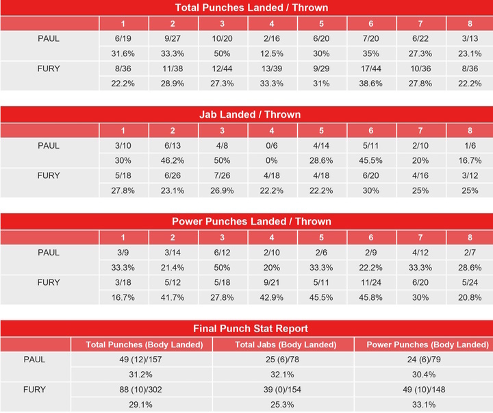 Tommy Fury doubled up Jake Paul in power punches landed (49-24). However, a jab from Paul put Fury down in the 8th and final round. Despite the knockdown, Fury notched the split decision victory by outworking Paul over the entirety of the eight rounds. Paul averaged 20 punches thrown and 6 punches landed per round while Fury averaged 38 and 11 respectively.